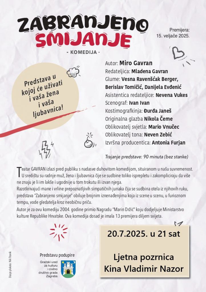 U Malom Lošinju će se ovoga srpnja održati 11. Dani Teatra Gavran. Manifestacija počinje u nedjelju, 20. srpnja, a publika će moći vidjeti najnoviju predstavu Teatra Gavran ‘Zabranjeno smijanje’ autora Mire Gavrana u kojoj nastupaju Vesna Ravenšćak Berger, Davor Svedružić i Danijela Evđenić.
