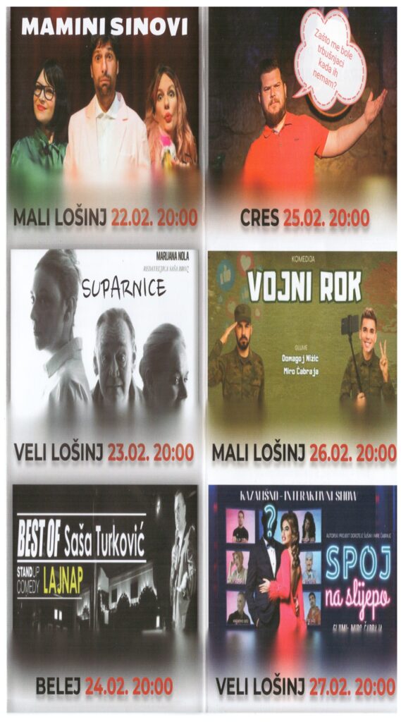 AKTUALNO Trenutno nema objava USKORO Trenutno nema objava ODIGRANO LIZISTRATA 24.3., 25.3. i 26.3. u 20 sati VLA VLA VLAJLAND CABARET 8.3.2026. u 20 sati DANI SMIJEHA 22. – 27. veljače LOŠINJ CRES Ljubav na prvi pogled 14.2. u 20 sati HUMANITARNI STAND UP BYBUJO TO JE TA ŠEMA – JOSIP ŠKILJO 26.11. u 20 sati Page1 Page2